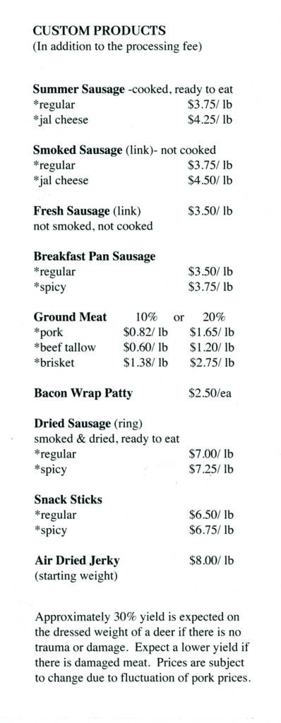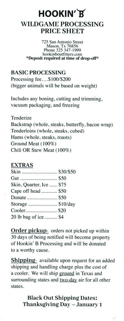 Orders not picked up within 30 days of being notified will become the property of Hookin’ B Processing and will be donated to a worthy cause.